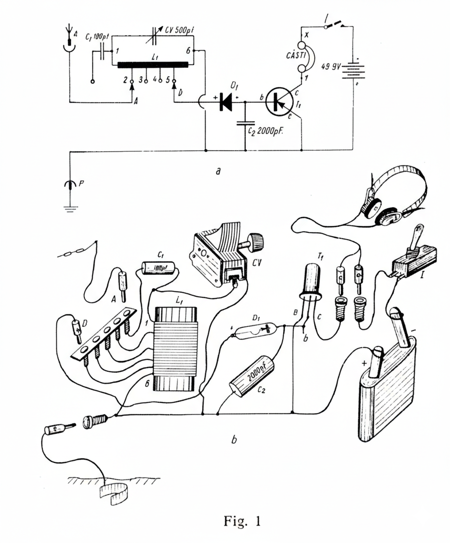 Semnalele radio sînt detectate de tranzistorul T1, iar cele de audiofrecvenţă se ascultă în căşti. Componentele de radiofrecvenţă sînt scurse la masă prin C4.