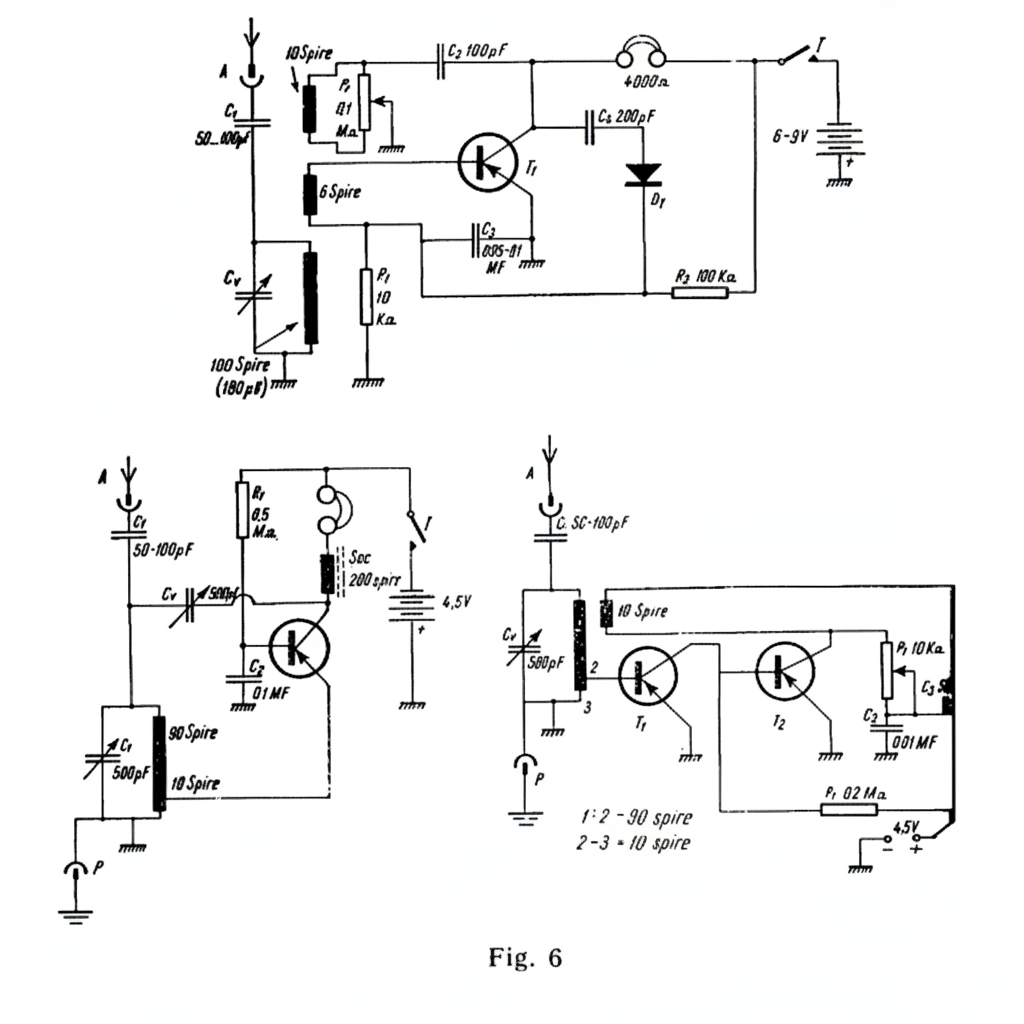 Pentru o mai amplă documentare şi experimentare în domeniul receptoarelor cu reacţie, prezentăm în figura 6 trei variante de scheme cu reacţie. Tranzistorul folosit la aceste scheme poate fi oricare din cele indicate pentru schema anterioară. De asemenea, bobinele se vor realiza după aceleaşi indicaţii.