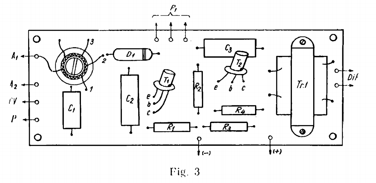Urmărind dispunerea făcută iniţial în figura 4 a, se plantează cîte o piesă, ce va fi consolidată pe loc, prin lipire cu cositor. Pentru conectarea celorlalte piese de plăcuţa cu cablu imprimat, în punctele notate A1, A2, a, b etc. vom lipi cu cablaj cîte o sîrmă de cupru groasă de 1 mm şi înaltă de 10 mm. De această sîrmă vorn conecta prin fire flexibile piesele în cauză. Placa se va prinde la rîndul ei de cutia aparatului cu ajutorul a patru şuruburi M3 şi a unor distanţori, folosindu-se pentru aceasta găurile practicate în colţuri.