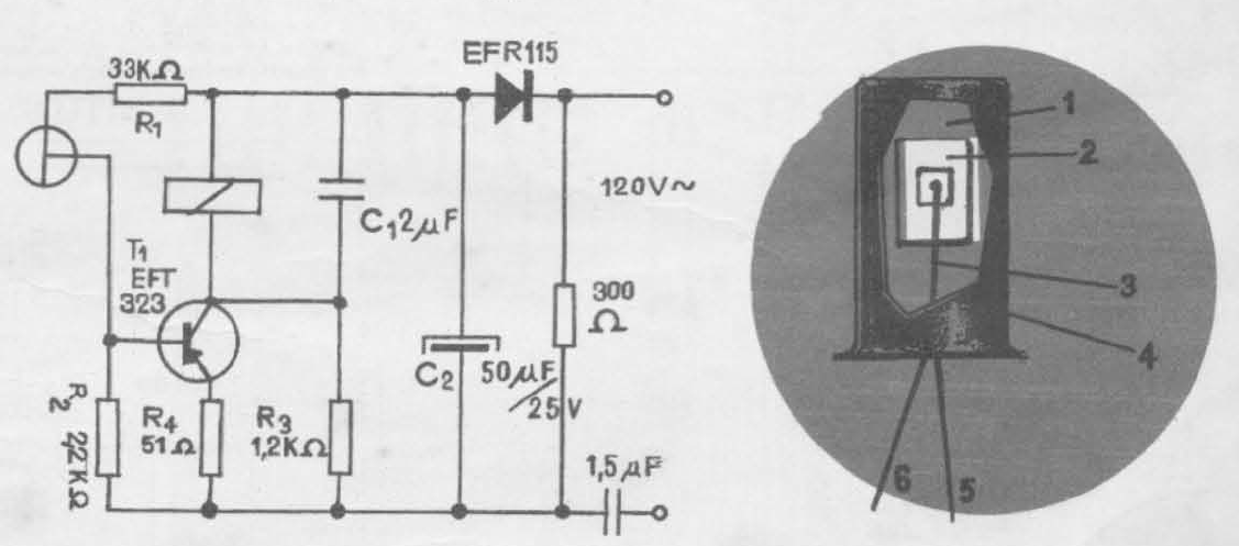 Tranzistorul este comandat de fotocelulă. Montajul de acționare a releului este realizat după schema de principiu din figura 2 și funcționează astfel: tranzistorul T1 este conectat într-un montaj de amplificator cu conexiunea emitor comun.